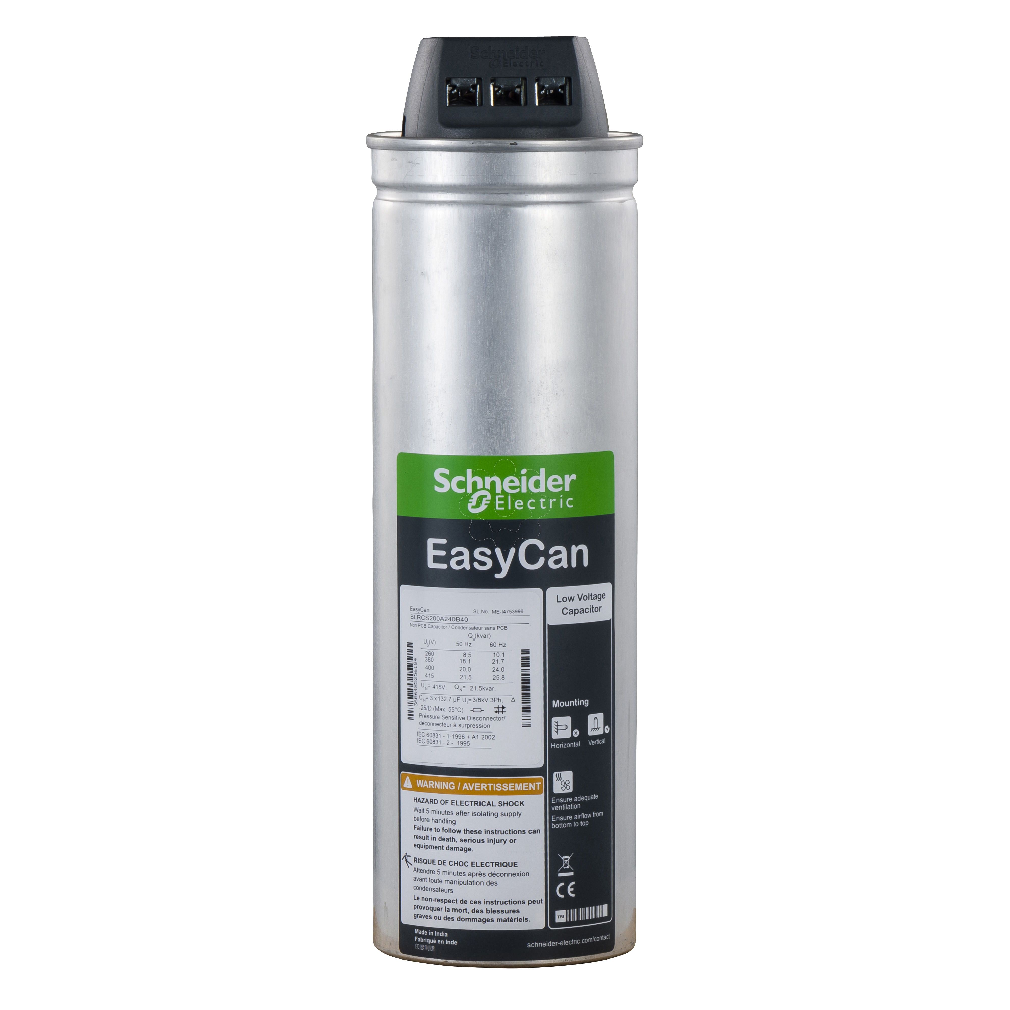 Capacitores EasyCan são projetados para trabalhar em redes levemente poluídas com reatores dessintonizados. Esses capacitores são usados para condições de operação padrão e quando não há cargas não lineares significativas. Esses capacitores são a escolha certa para maximizar a economia em um sistema elétrico estável. Este capacitor fornece uma potência de saída nominal de 18,1 kVar a 380 V AC, 50 Hz. Fixação assegurada por um terminal ClampTite. Este componente atende às normas IEC 60831-1 e IEC 60831-2. O peso do produto da caixa é de 2,3 kg.