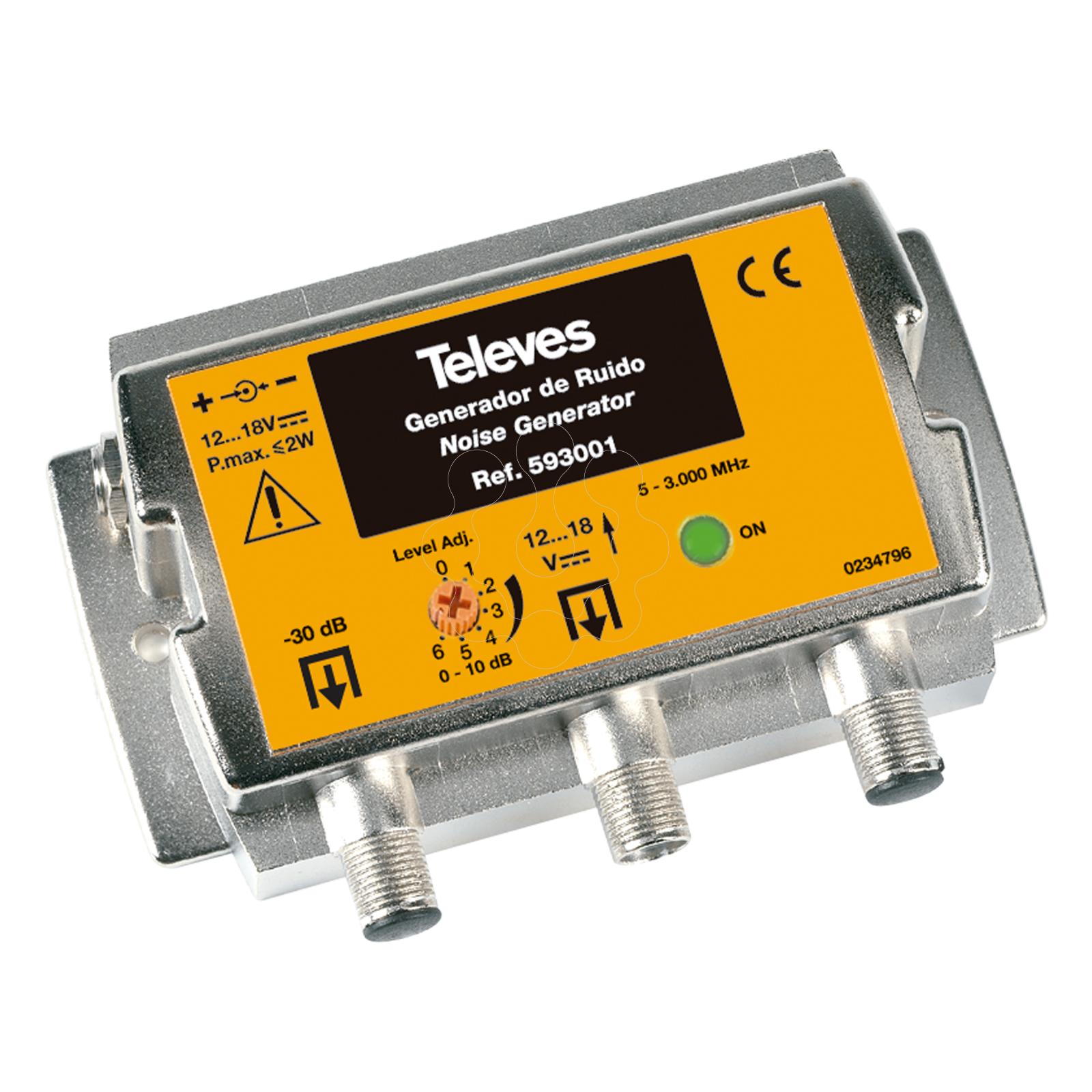 Gerador de ruído 5...3000MHz. Gerador de ruído 5...3000MHz. Dispositivo desenhado para permitir realizar ensaios de atenuação e planicidade em instalações SMATV e CATV. Ferramenta indispensável para ensaios ITED e ITUR . Saída de teste atenuada 30dB e saída normal. Comutador rotativo que permite variar 10 ± 2 dB o nível de saída nas duas saídas. Led indicador de ligado. Alimentar externo através de fonte alimentação DC. Funcionamento através de fonte de alimentação local ou através de corrente via cabo coaxial como seja o medidor de campo.