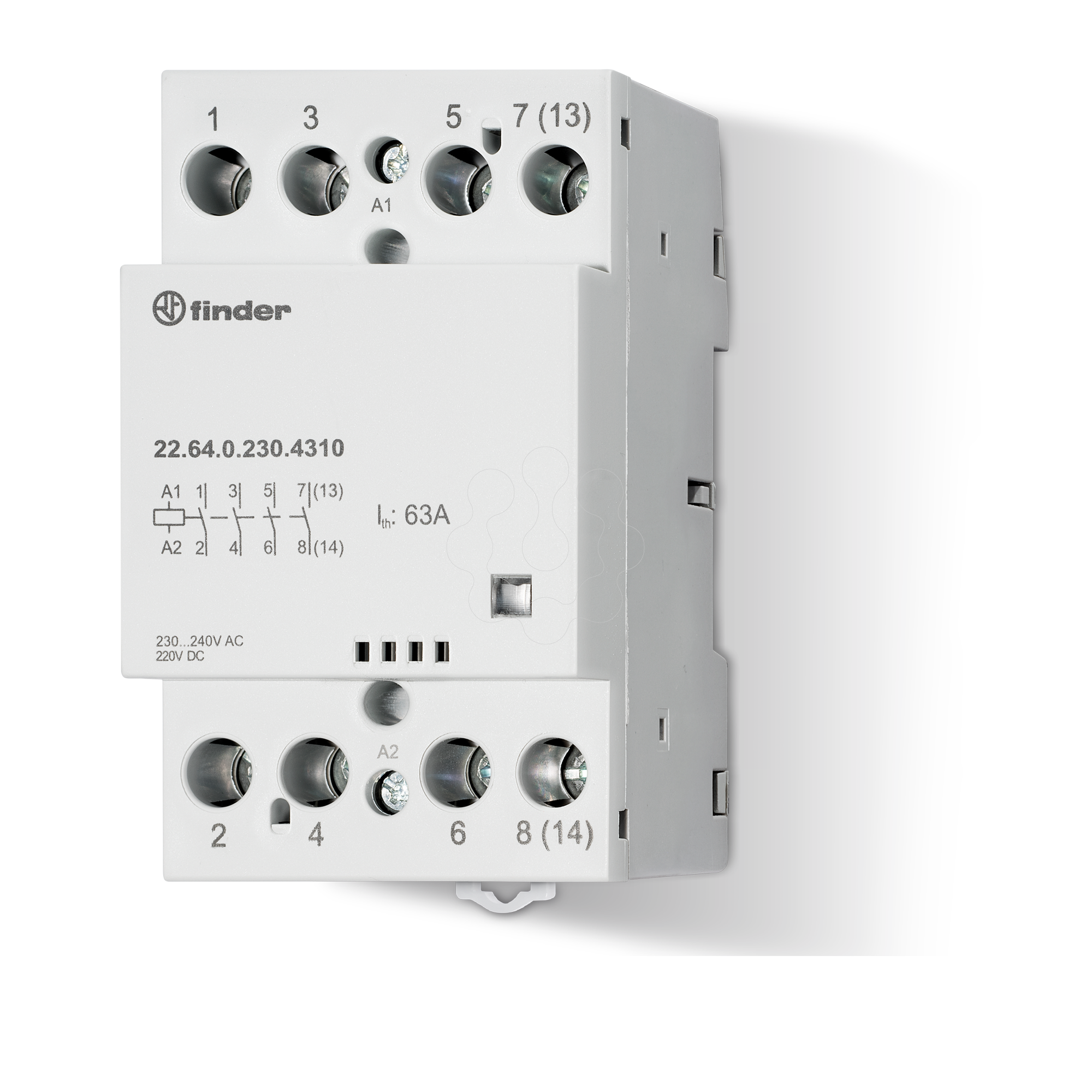 Contator modular 4NA Material dos contatos: AgSnO2 Tensão nominal de operação: 400 V. Carga máxima lâmpada incandescente: 5000 W. Carga máxima lâmpada fluorescente: 2000 VA. Tipo de tensão (tensão de excitação): AC/DC Tensão de excitação nominal: de 196 a 264 V. Tipo de tensão (tensão de operação): AC Corrente nominal de operação: 40 A. Possibilidade de equipamento adicional: sim Grau de proteção: IP 20 opcional: Indicador mecânico