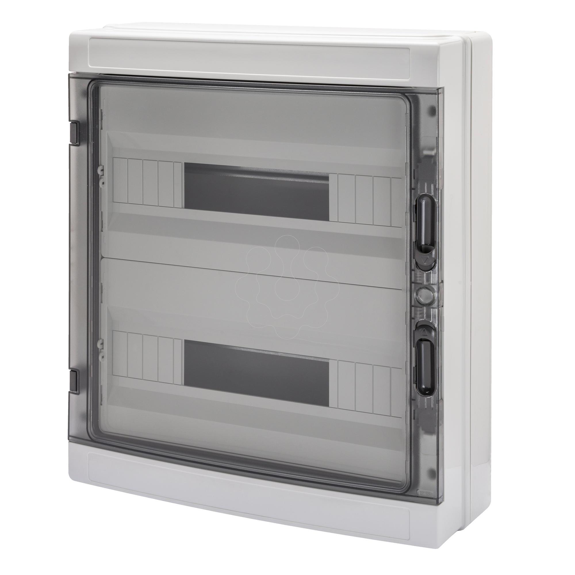 "Série 40 CD - Caixas e painéis de distribuição de montagem saliente - A série 40CD de painéis de distribuição de montagem saliente, disponível nas versões com porta transparente fumada ou cega e em tamanhos de 8 a 72 módulos, garante uma integração estética em todos os tipos de ambientes. A oferta inclui: 40CDK - IP65 - quadros estanques com caixilho amovível (a partir de 24M), painéis seláveis, acessíveis com condutas de cablagem, fechadura, tampas estéticas e painéis cegos