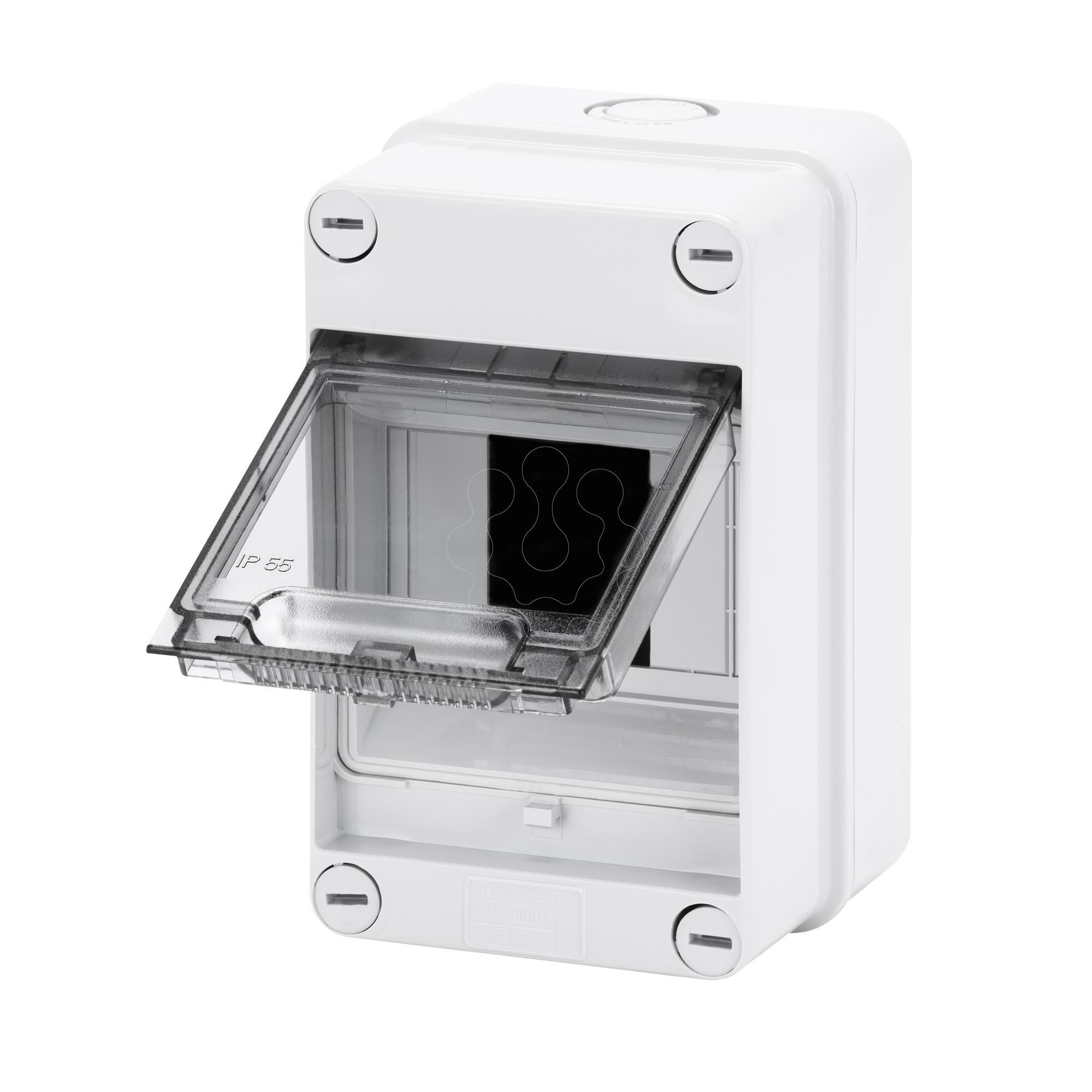 "Série 40 CD - Caixas e painéis de distribuição de montagem saliente - A série 40CD de painéis de distribuição de montagem saliente, disponível nas versões com porta transparente fumada ou cega e em tamanhos de 8 a 72 módulos, garante uma integração estética em todos os tipos de ambientes. A oferta inclui: 40CDK - IP65 - quadros estanques com caixilho amovível (a partir de 24M), painéis seláveis, acessíveis com condutas de cablagem, fechadura, tampas estéticas e painéis cegos