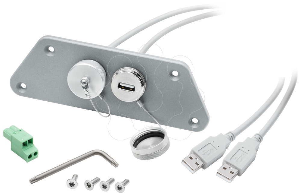 2-port USB interface set RAL9023 (gray), with USB 2.0 socket, Type A, including mounting material for basic adapter for PRO devices Further information, Quantity and content: see technical data 2-Port-USB-Schnittstellen-Set RAL 9023 (grau), mit USB 2.0 Buchse, Typ A, inkl. Montagematerial für Basisadapter für PRO Geräte. Zubehör für HMI