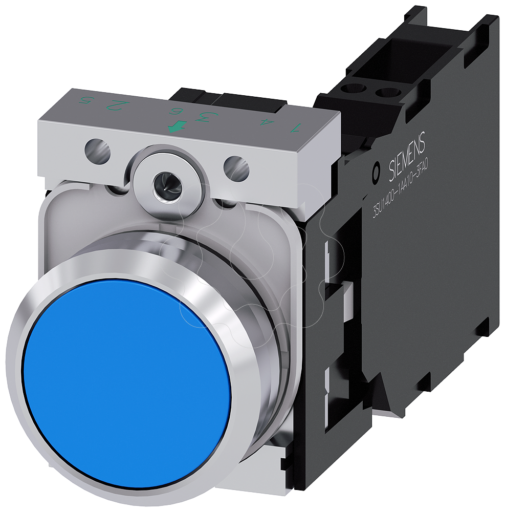 botão, 22 mm, redondo, metal, de alto brilho, azul, botão de pressão, plano, tecla com retorno, 1NA+1NF, conexão de mola, Z=20x embalado