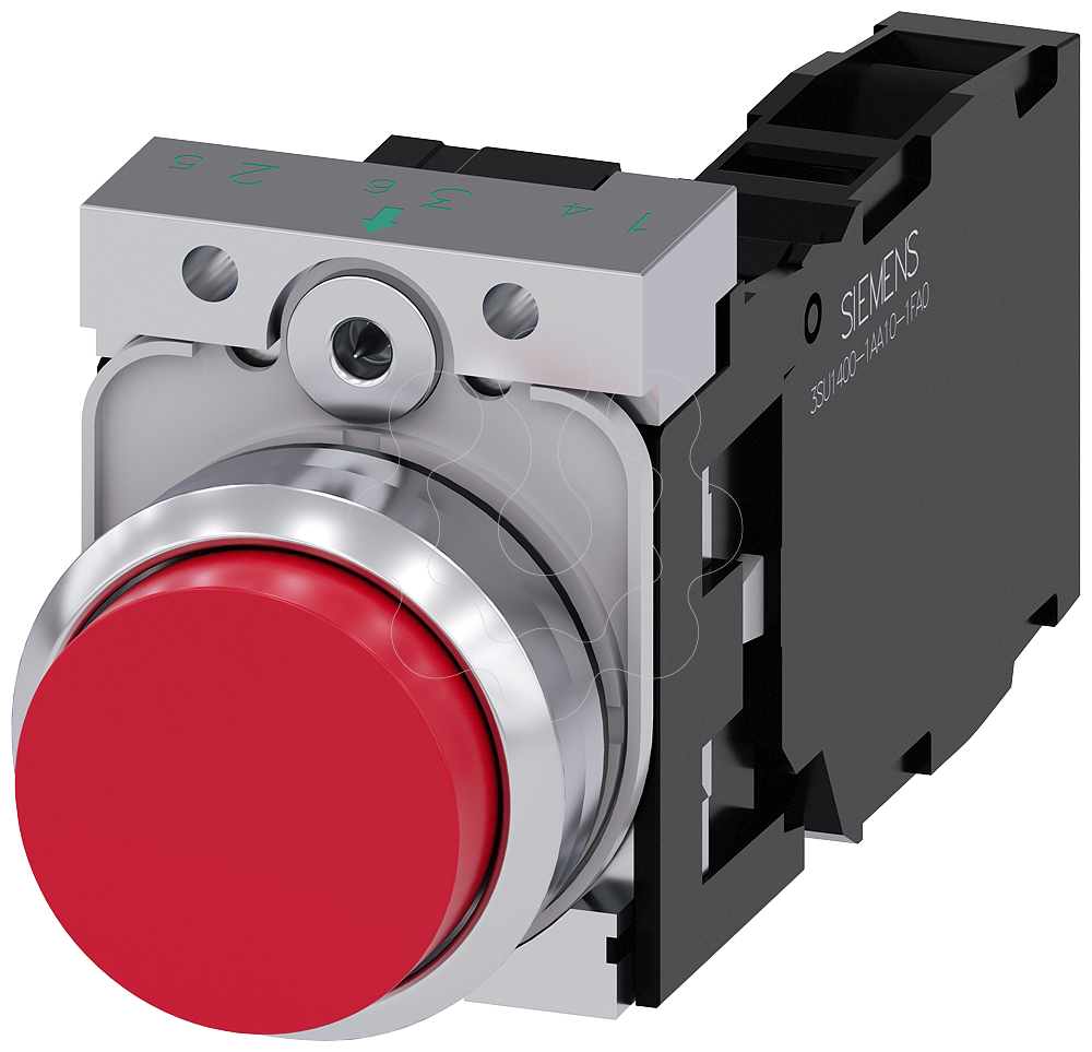 botão, 22 mm, redondo, metal, de alto brilho, vermelho, botão de pressão, alto, tecla com retorno, com suporte, 1NA+1NF, conexão parafusada, com in...