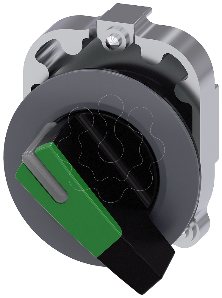 interruptor com manípulo, iluminável, 30 mm, redondo, metal, mate, verde, manípulo, comprimento, anel frontal para montagem plana, 2 posições de co...