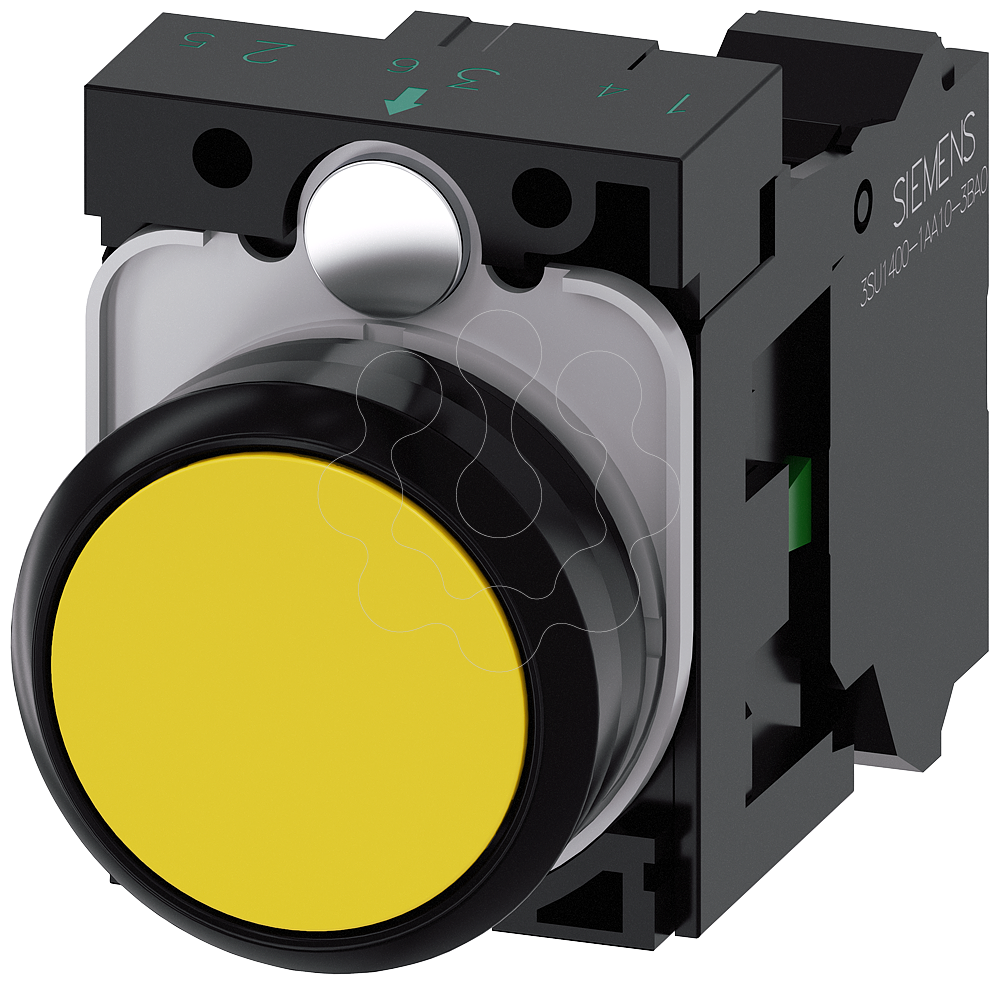 botao, 22 mm, redondo, plastico, amarelo, botao de pressao, plano, tecla com retorno, com suporte 1NA, conexao de mola, com inscricao a laser, letr...