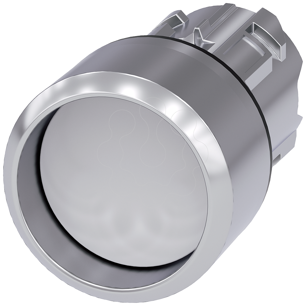 botão, 22 mm, redondo, metal, de alto brilho, branco, anel frontal, alto, tecla com retorno, com inscrição a laser, letras maiúsculas