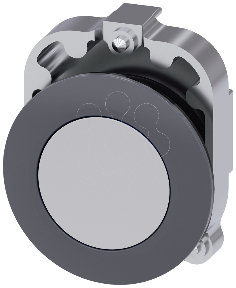 Botão de pressão, 30 mm, redondo, metal, mate, cinza, anel frontal para montagem plana, tecla com retorno