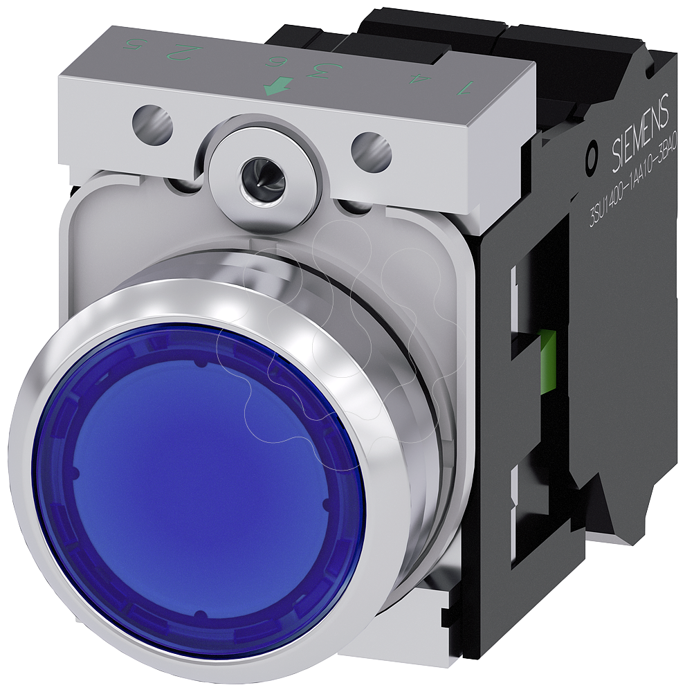 Botão de pressão, iluminado, 22mm, redondo, metal, alto brilho, azul, 1NA