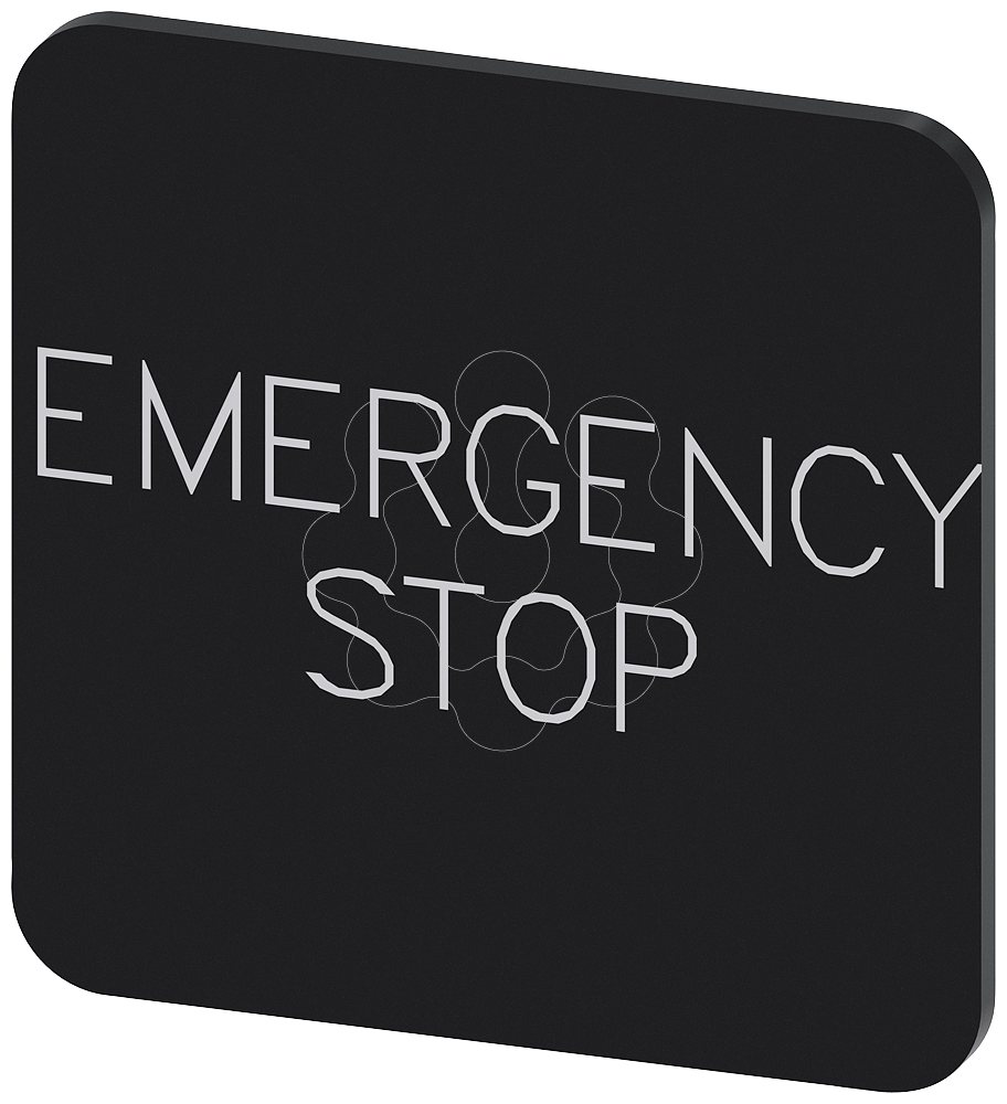 Placa de identificacao 22x22mm, placa preto, inscricao: Emergency Stop