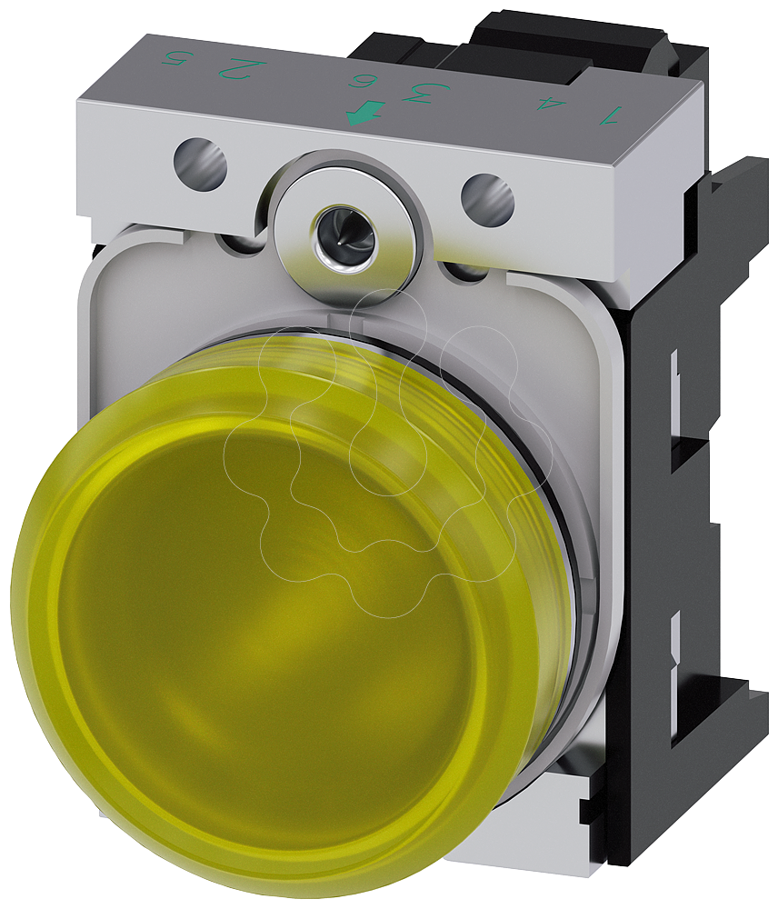 indicador luminoso, 22 mm, redondo, metal, de alto brilho, amarelo, lente, plano, com suporte, módulo LED com LED integrado 230 V CA, conexão de mo...
