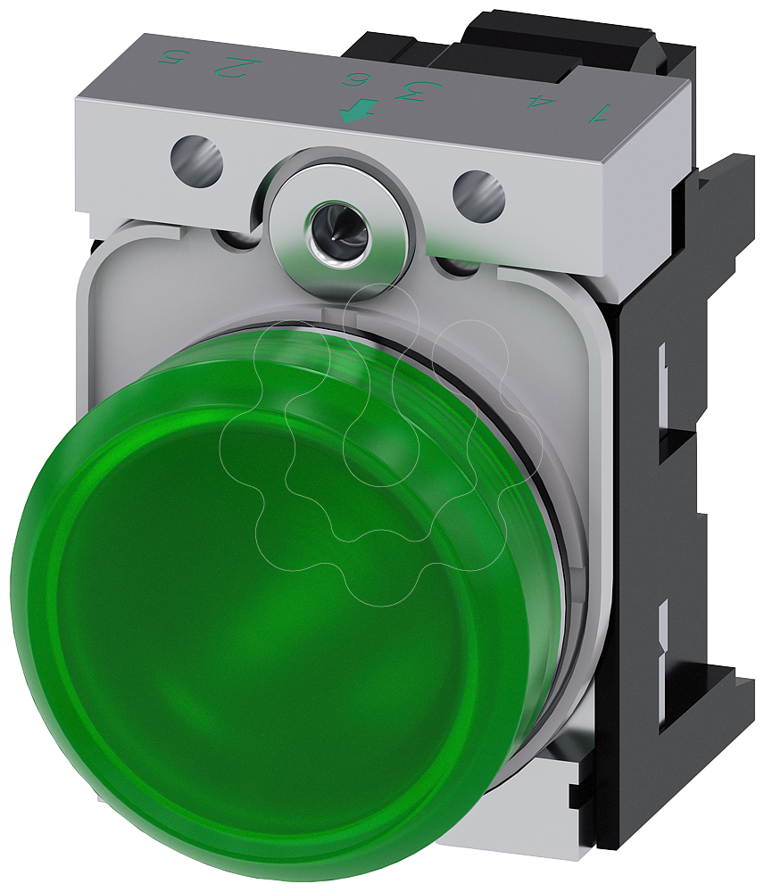 indicador luminoso, 22 mm, redondo, metal, de alto brilho, verde, lente, plano, com suporte, módulo LED com LED integrado 230 V CA, conexão de mola...