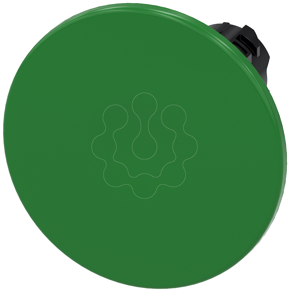 botão tipo cogumelo, 22 mm, redondo, plástico, verde, 60 mm, tecla com retorno, com inscrição a laser, inscrição ou símbolo seleção específica do c