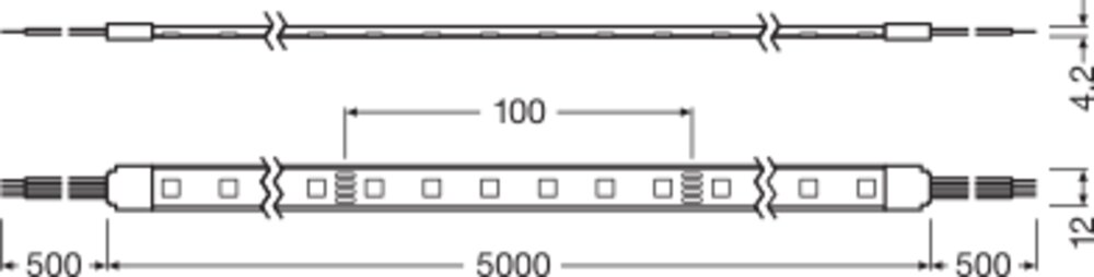 LED STRIP VALUE-500 RGB PROTECTED -500/RGB/5/IP65. Fitas LED RGB protegidas IP65 com 500 lm/m para iluminação geral. Características do Produto: Fita de LED flexível e divisível com LEDs RGC com múltiplos chips em linha. Unidade mais pequena divisível: 100 mm . Vida útil (L70/B50): até 40.000 h a Tc máx.: 75°C. Tipo de proteção: IP65. A prova de névoa salina. Altamente resistente à UV. Dimerizável por modulação de largura de pulso (PWM). Vantagens do Produto: Grande variedade de opções de design graças às fitas LED RGB flexíveis. Troca de cor uniforme. Fácil instalação, não são necessárias ferramentas para a ligação. Fácil montagem em muitas superfícies lisas devido à fita autocolante. Flexibilidade máxima devido à vasta gama de acessórios. Conexão simples graças aos cabos integrados nos dois lados. Áreas de Aplicação: Adequada para aplicações internas e externas (IP64). Iluminação de destaque de fachadas. Iluminação de efeito na arquitetura. Efeitos dinâmicos em áreas públicas. Iluminação com sancas. Iluminação de armários. Hotéis e Escritórios. Interiores de residências.. Fitas LED RGB protegidas IP65 com 500 lm/m para iluminação geral | Fita de LED flexível e divisível com LEDs RGC com múltiplos chips em linha | Potência nominal: 67,00 W | Tensão nominal: 24 V | Fluxo luminoso: 2150 lm | Ângulo de abertura: 2800 mA | Comprimento (incl.luminárias redondas): 5000.00 mm | Altura (incl.luminárias cilind.): 4.20 mm | Largura (incl.luminárias redondas): 12.50 mm | Vida mediana L90/B10 @ 25 °C: 40000 h