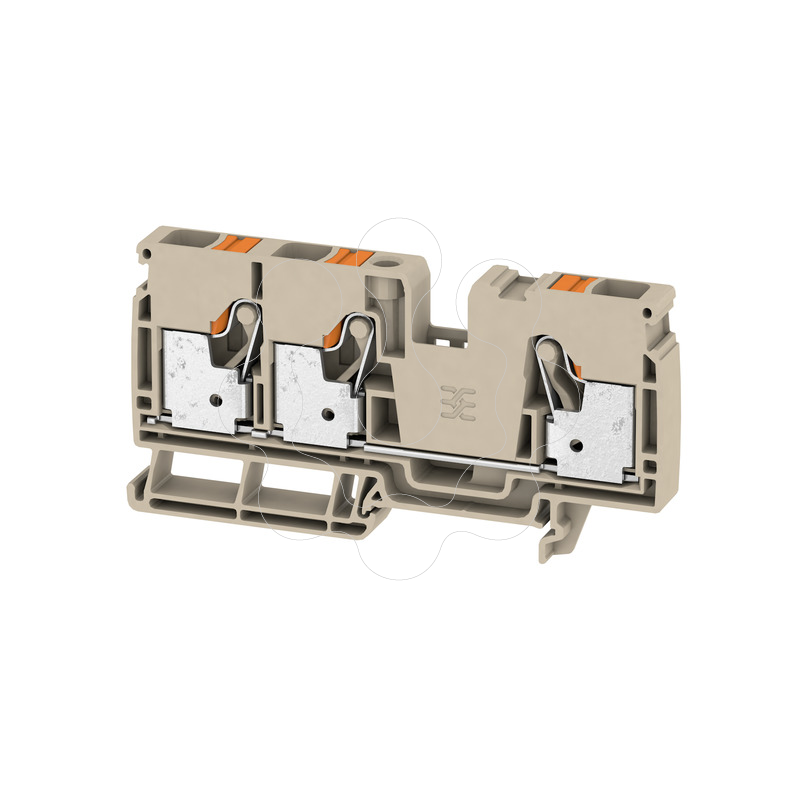 Bloque de bornes de paso, PUSH IN, 10 mm², 1000 V, 57 A, Número de conexiones: 3. Regleta de bornes para la conexión o el empalme de conductores con contacto garantizado permanente. Acero endurecido capaz de soportar fuerzas mecánicas y revestimiento de cobre para garantizar la máxima conductividad.